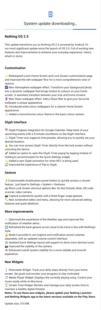 Äntligen har Nothing påbörjat utrullningen av Android 14 tillsammans med Nothing OS 2.5. Den här uppdateringen är 210 MB stor och den är således relativt liten med tanke på hur mycket som är nytt i den här uppdateringen.